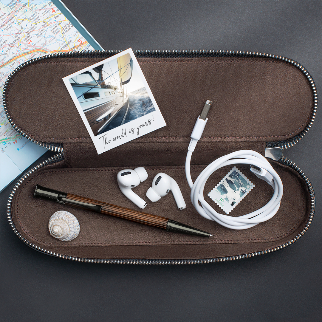 Die Metallteile sind mit einer PVD-Beschichtung aus Titan veredelt. Diese moderne Beschichtung sorgt nicht nur für eine elegante Optik, sondern macht die Oberfläche besonders widerstandsfähig gegen Kratzer und Abnutzung. Ein massiver, gefederter Clip ermöglicht zudem ein sicheres Befestigen an Notizbuch, Hemdtasche oder Kalender.