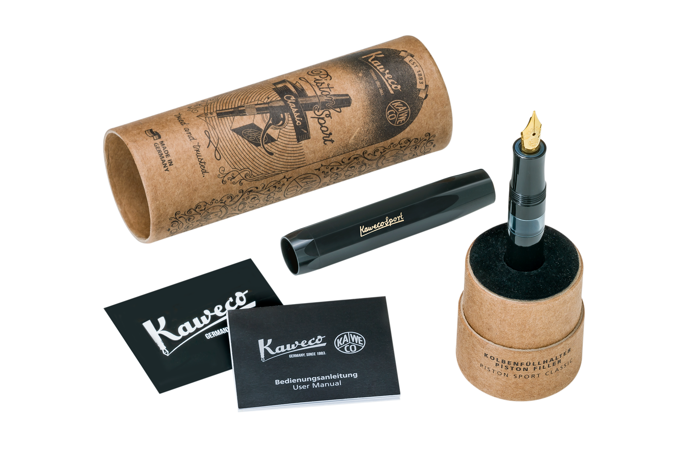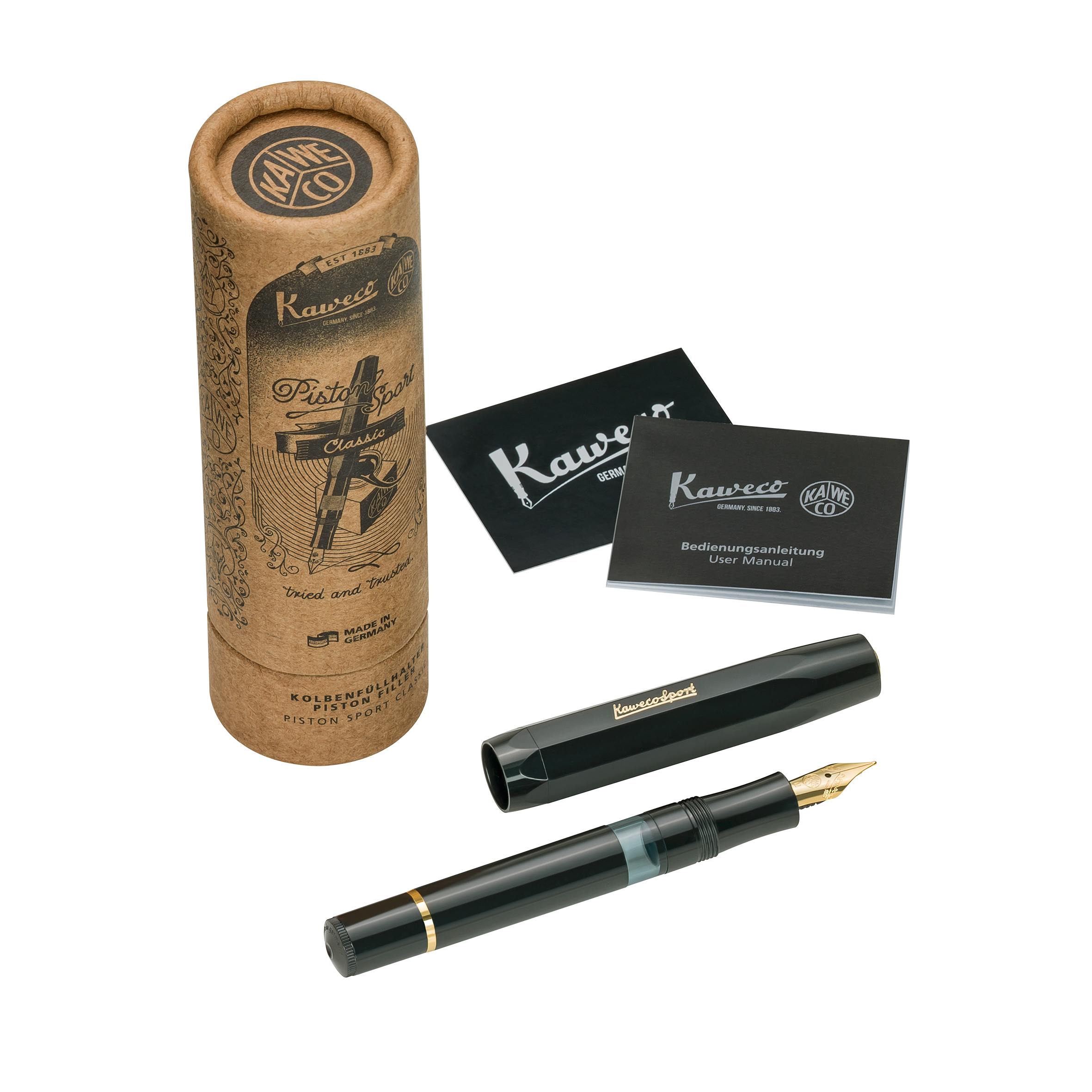 Der Kaweco Piston Sport Classic wird aus hochwertigem Kunststoff in Deutschland hergestellt, händisch montiert und geprüft. Das leichte Material und die optimale Stiftlänge mit aufgesteckter Kappe lassen das Schreibgerät federleicht über das Papier gleiten und die Hand selbst nach langen Schreibperioden nicht ermüden. Die auf den Füllhalter perfekt abgestimmte Federeinheit sorgt für einen satten Tintenfluss und vermittelt somit ein besonders weiches Schreibgefühl. Durch die Kombination mit goldenen Zierelementen wird die Funktionalität mit stilsicherer Eleganz erweitert und vereint damit traditionelle Füllmethoden mit dem modernen Zeitalter.