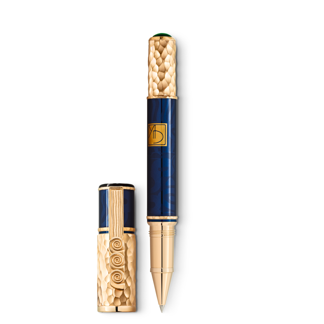 Der Schaft und die Kappe bestehen aus durchscheinendem, dunkelblauem Lack in Kombination mit gehämmertem, gelbvergoldetem Metall. Farbige Details greifen Motive aus Klimts „Goldener Periode“ auf – darunter „Adele Bloch-Bauer I“, der Stoclet-Fries und erneut „Der Kuss“.