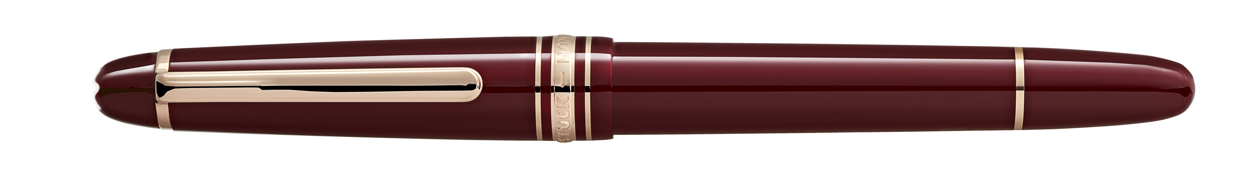 Kappe und Korpus des Meisterstück Füllfederhalters sind aus hochwertigem, burgunderrotem Edelharz gefertigt und mit glänzenden Goldbeschlägen veredelt. Das ikonische weiße Montblanc Emblem ist stilvoll in die Kappe eingelegt und unterstreicht die unverwechselbare Identität der Marke.