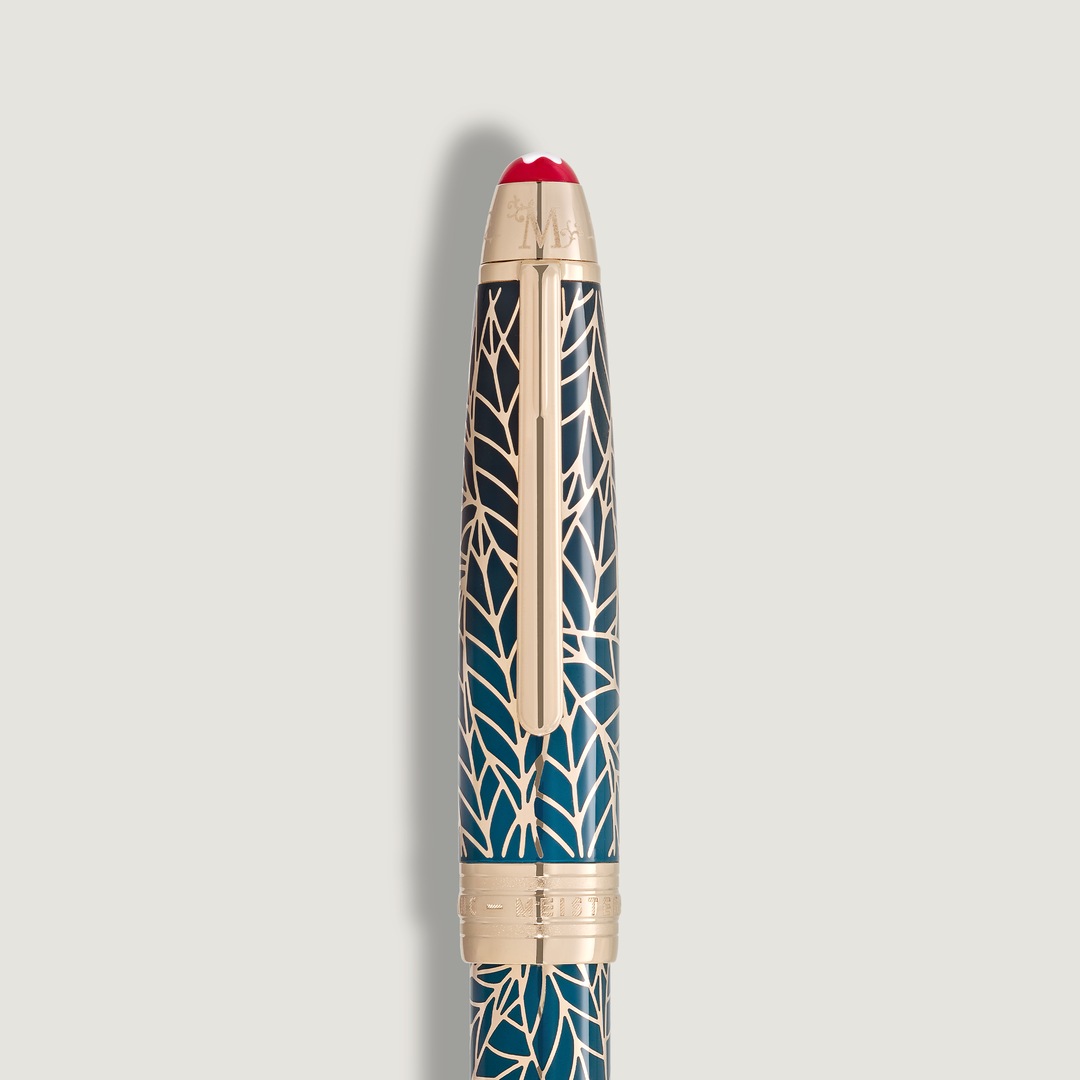 Die Romeo & Juliet Solitaire Edition symbolisiert die Verschmelzung der Liebenden. Die goldbeschichtete Kappe trägt die Initialen der Familiennamen „M“ und „C“. Kappe und Korpus sind in einem sanften Blaugrün-Lackverlauf von hellem zu sattem Grün gehalten und mit einem filigranen Blattmuster mit Goldauflage verziert. Dornige Zweige winden sich um Konus und Kappenspitze und stehen für den Schmerz einer Liebe, die ein tragisches Ende nahm.